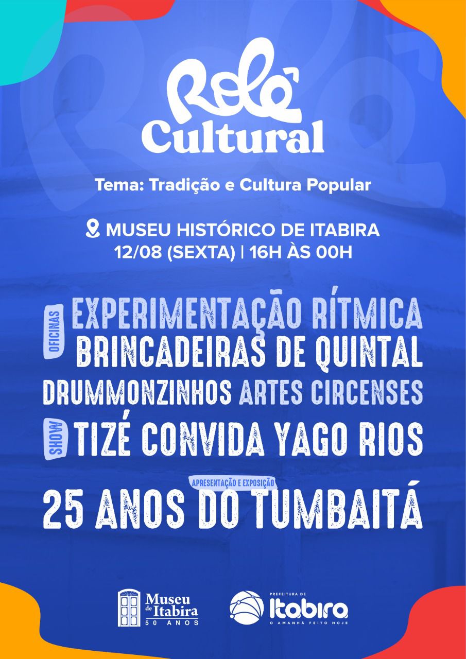 Na sexta-feira (12), a partir das 16h, o Museu de Itabira recebe a programação do Rolê Cultural, com oficina de experimentação rítmica, brincadeiras de quintal, Drummonzinhos e barraquinhas. Em especial, esta edição, que traz como tema tradição e cultura popular, celebra os 25 anos do grupo itabirano Tumbaitá, com uma exposição comemorativa e uma apresentação do grupo. Para encerrar a noite, show com Tizé e Yago Rios.