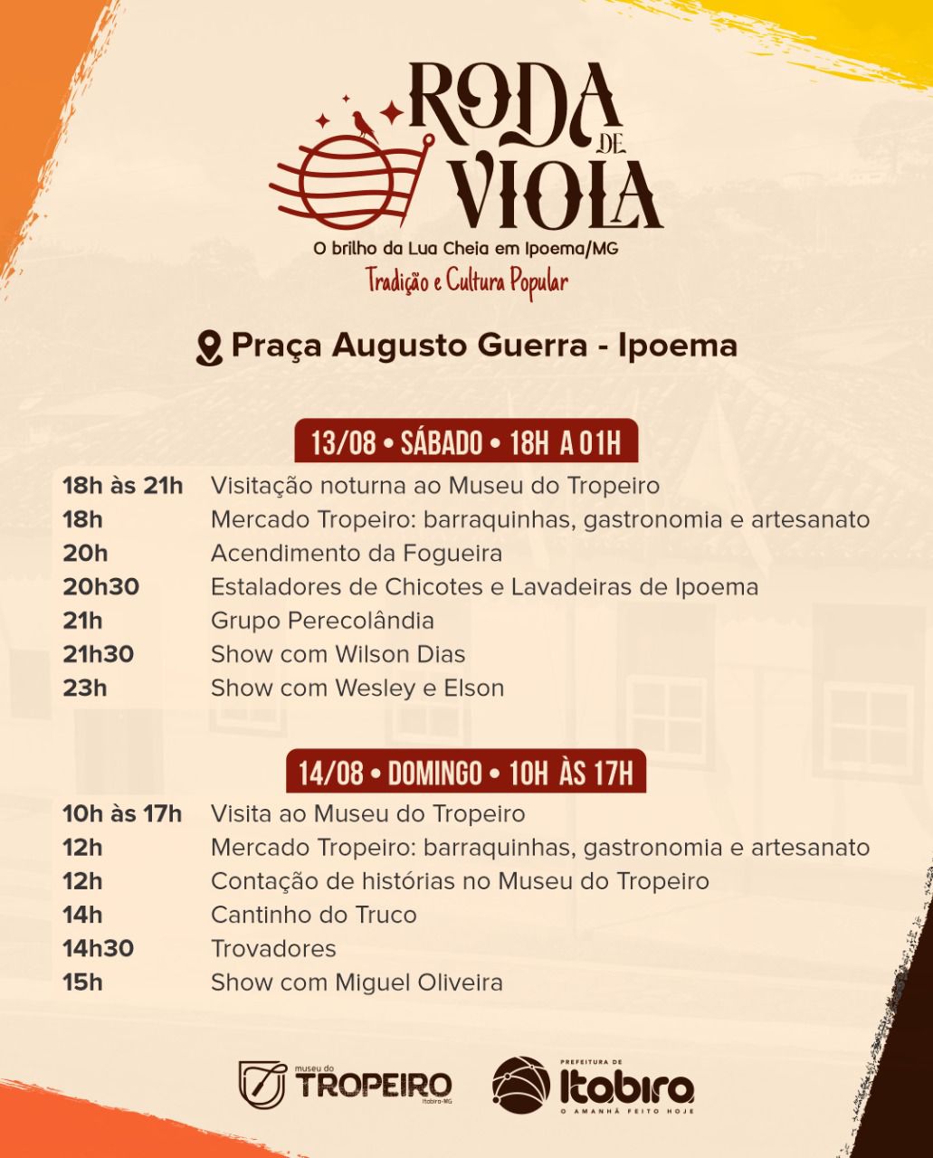 Já em Ipoema, o evento acontece sábado e domingo. No sábado (13), o Museu do Tropeiro realiza na praça Augusto Guerra, a aclamada Roda de Viola com o mesmo tema do Rolê Cultural “Tradição e cultura popular”. A programação começa às 17h, com o Mercado Tropeiro, com muita moda de viola, acendimento da fogueira, estaladores de chicote, Lavadeirasde Ipoema, grupo Perecolância e show com Wilson Dias e encerramento da noite com apresentação de Wesley e Elson.