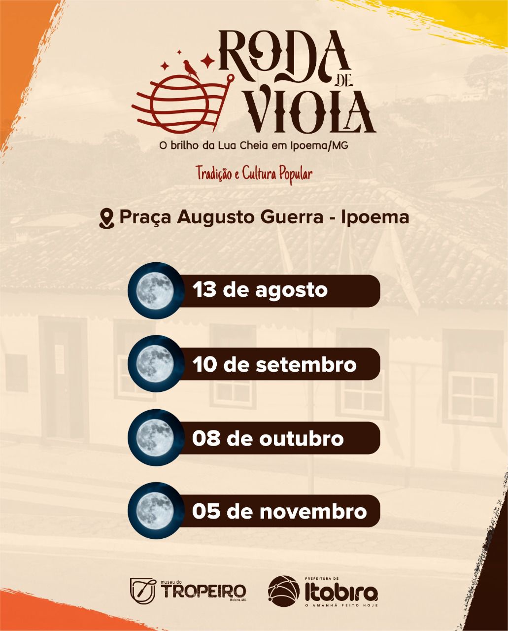 O final de semana promete em Itabira. Acontece nos dias 12, 13 e 14  de agosto, o Circuito Cultural da Lua Cheia, que traz dois eventos tradicionais e importantes para a cidade: Roda de Viola no Museu do Tropeiro, em Ipoema e Rolê Cultural no Museu de Itabira. Seguindo um novo formato, as duas atividades têm como objetivo principal promover o entretenimento, diversão e a cultura para a comunidade, além de serem importantes eventos turísticos para atrair visitantes.