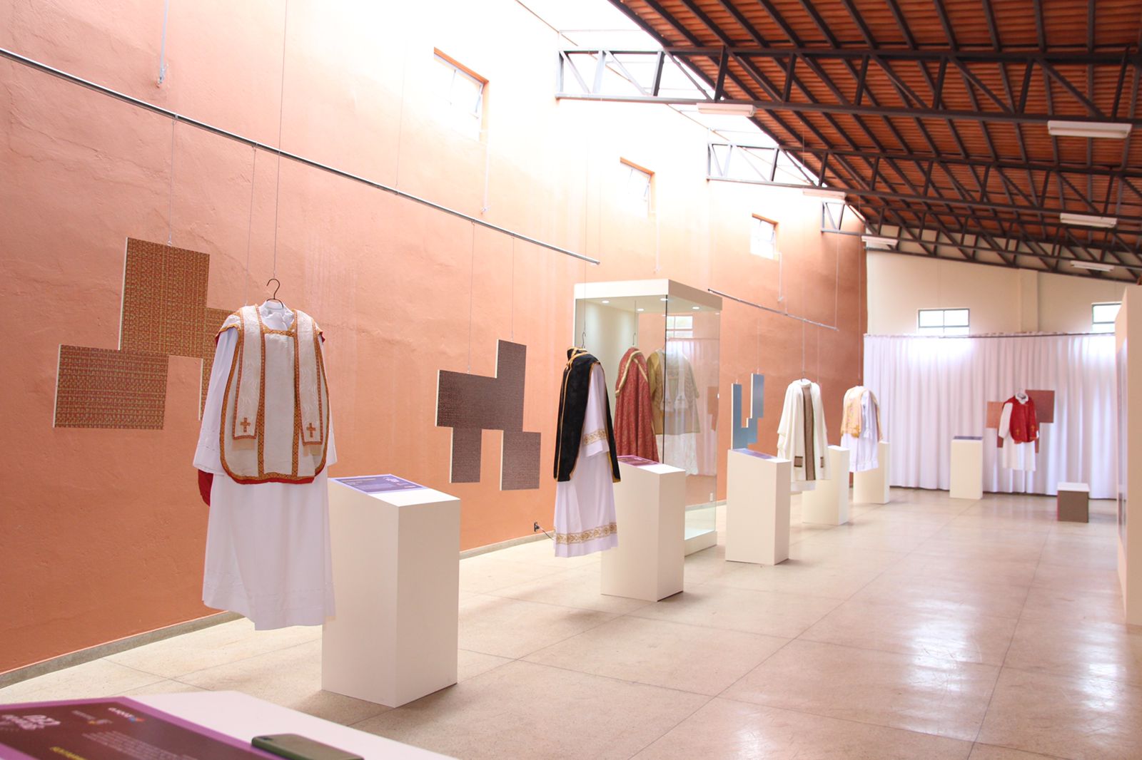 De acordo com a Diocese de Itabira – Coronel Fabriciano, organizadora da exposição junto com a Prefeitura, as vestes litúrgicas são usadas pelos clérigos e fiéis leigos para a celebração de missas e outras cerimônias do culto cristão. Nesta exposição há alguns exemplos de paramentos litúrgicos: casulas, dalmática, alvas, capa pluvial e vestimentas da Marujada. Essas indumentárias são utilizadas no corpo dos clérigos e dos fiéis durante as celebrações. Tais paramentos são feitos de materiais nobres, como a seda e fios de ouro, e confeccionados por meio de técnicas que requerem tempo de dedicação na elaboração de seus bordados.