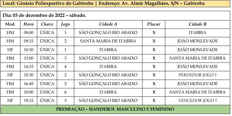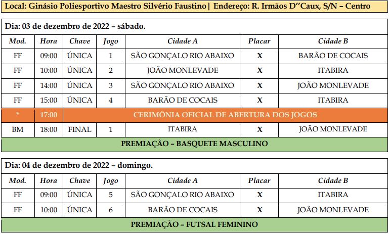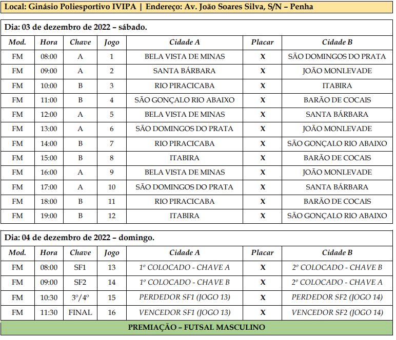 A cerimônia de premiação de cada modalidade será realizada após o término de todas as partidas, sendo obrigatório a presença das equipes 1ª, 2ª e 3ª colocadas para recebimento de troféus e medalhas. Confira a tabela dos jogos: